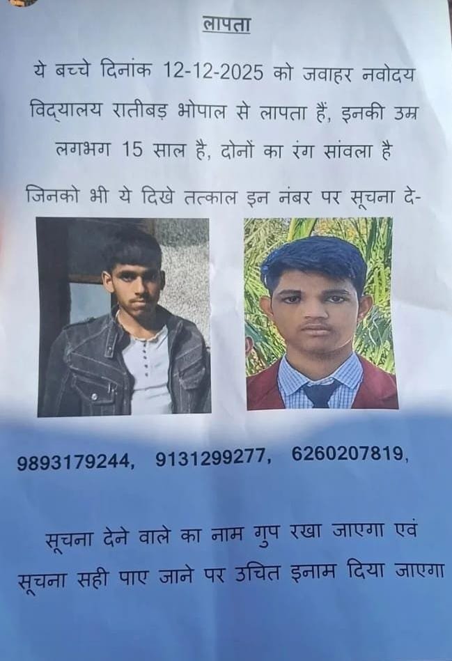 ब्रेकिंग भोपाल: जवाहर नवोदय विद्यालय रातीबड़ से दो छात्र लापता, परिजनों ने स्कूल प्रबंधन पर उठाए सवाल