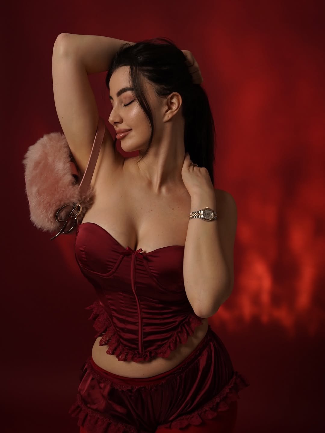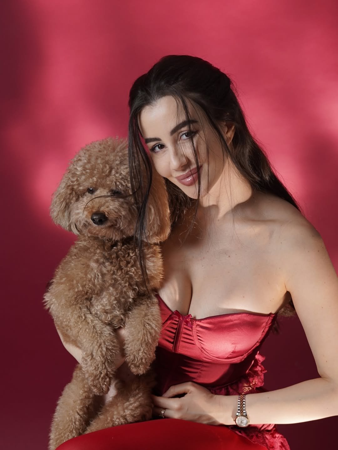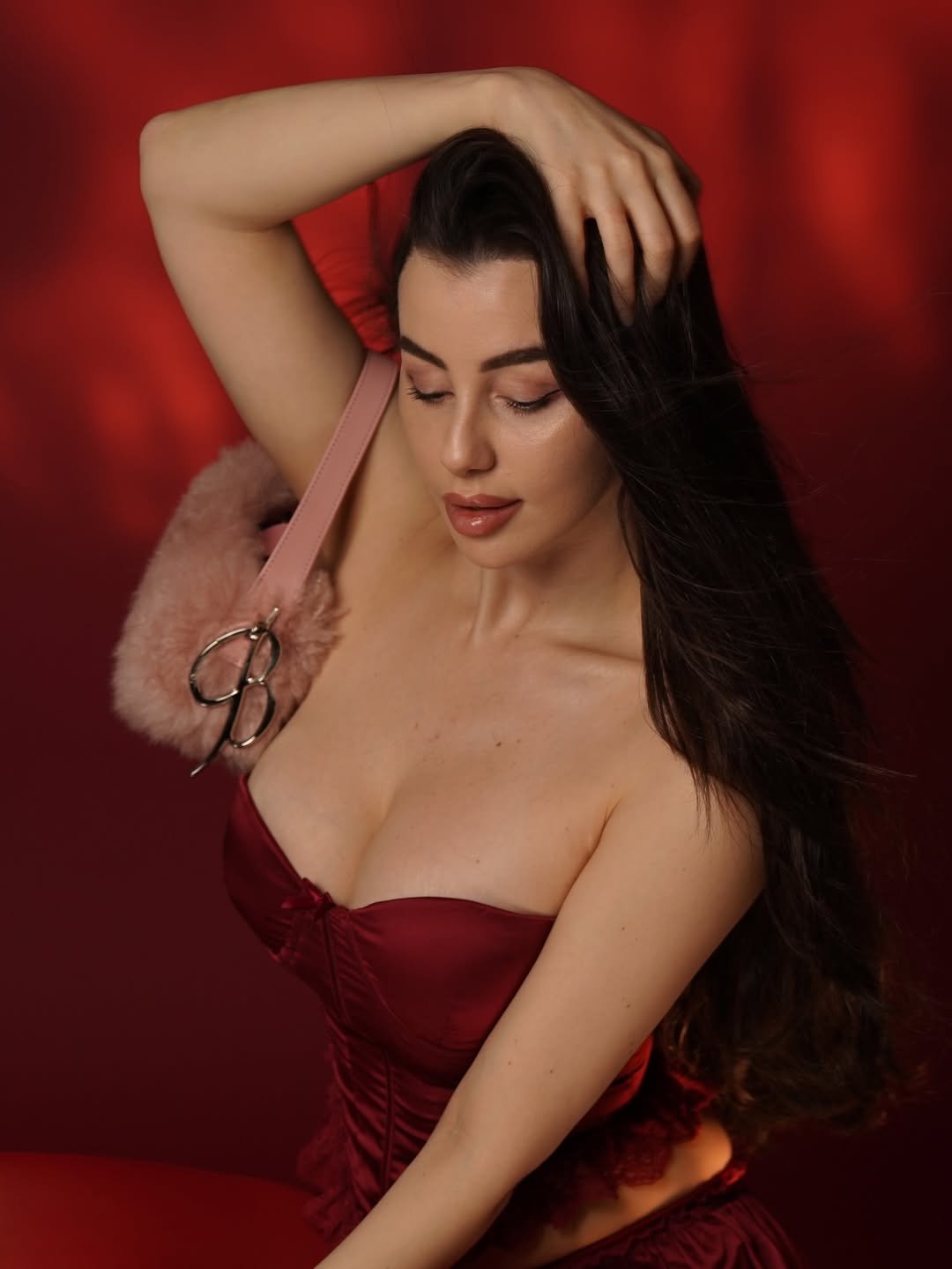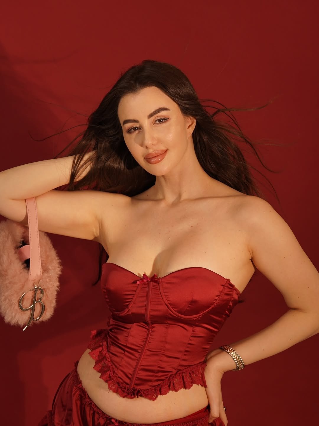 इस खास क्रिसमस फोटोशूट में जॉर्जिया एंड्रियानी को गहरे लाल (रेड) बैकड्रॉप के सामने पोज़ देते हुए देखा जा सकता है। उन्होंने स्ट्रैपलेस रेड सैटिन कॉर्सेट टॉप पहना है, जिस पर नाजुक लेस ट्रिमिंग की गई है। इसके साथ उन्होंने मैचिंग रफल्ड स्कर्ट कैरी की है, जो उनके लुक को और भी ग्रेसफुल बना रही है।