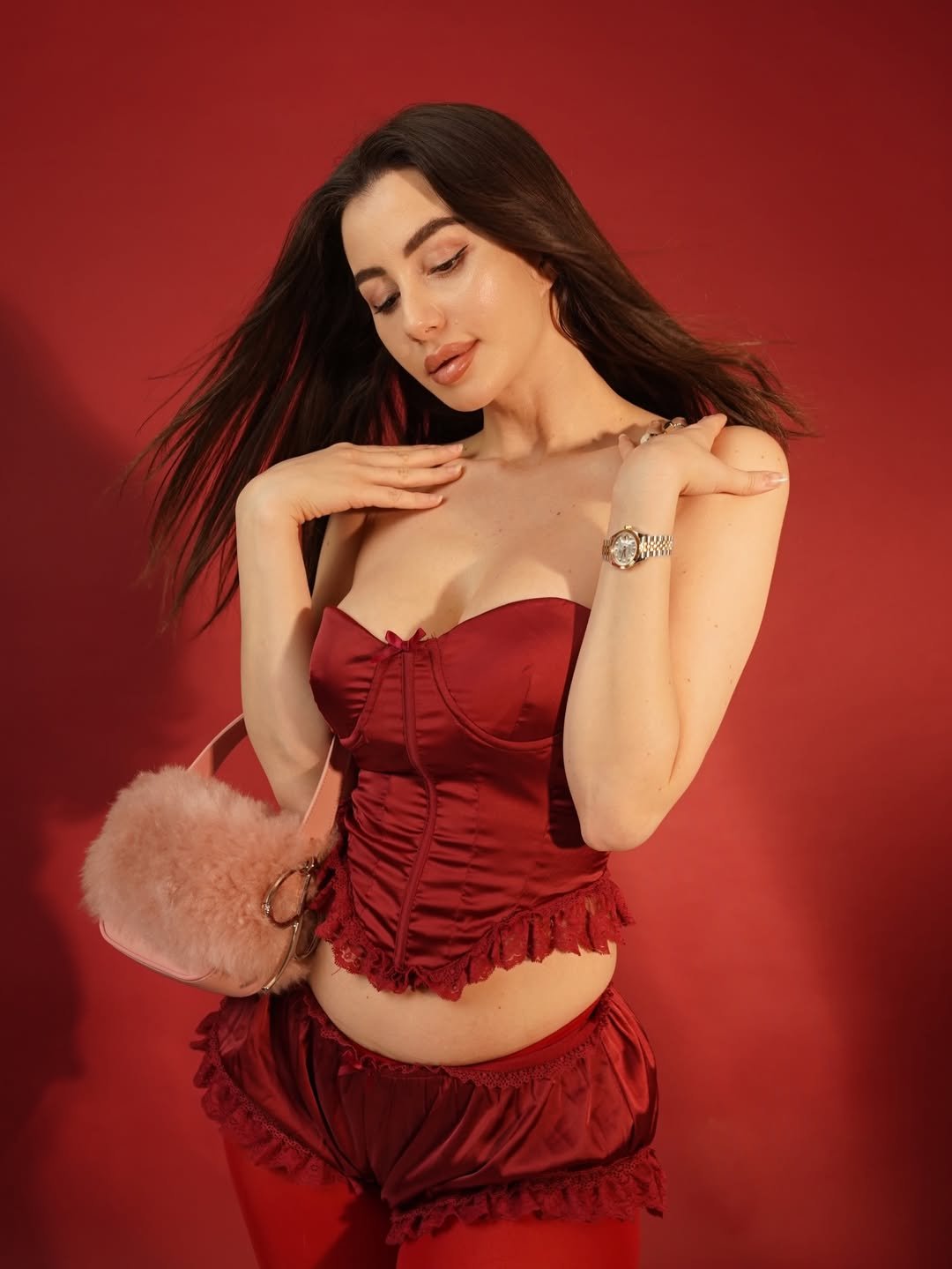 इस खास क्रिसमस फोटोशूट में जॉर्जिया एंड्रियानी को गहरे लाल (रेड) बैकड्रॉप के सामने पोज़ देते हुए देखा जा सकता है। उन्होंने स्ट्रैपलेस रेड सैटिन कॉर्सेट टॉप पहना है, जिस पर नाजुक लेस ट्रिमिंग की गई है। इसके साथ उन्होंने मैचिंग रफल्ड स्कर्ट कैरी की है, जो उनके लुक को और भी ग्रेसफुल बना रही है।