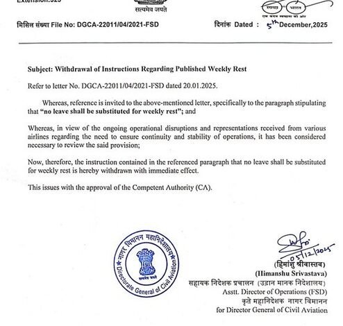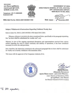 यात्रियों की बढ़ती कठिनाइयों और एयरलाइंस की परेशानियों को देखते हुए DGCA ने अब अपने आदेश को वापस ले लिया है। DGCA के इस कदम के बाद इंडिगो और अन्य एयरलाइंस को राहत मिली है और हवाई सेवाओं के जल्द ही सामान्य होने की संभावना बन गई है।