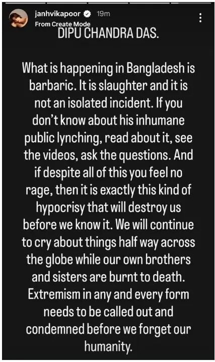 जान्हवी कपूर ने गुरुवार को अपनी इंस्टाग्राम स्टोरी में दीपू चंद्र दास की हत्या पर लंबा संदेश साझा किया। उन्होंने कहा कि बांग्लादेश में यह केवल एक घटना नहीं है, बल्कि लगातार हो रही हिंसा का हिस्सा है। जान्हवी ने स्पष्ट किया कि किसी भी रूप में उग्रवाद और हिंसा को नजरअंदाज नहीं किया जाना चाहिए।