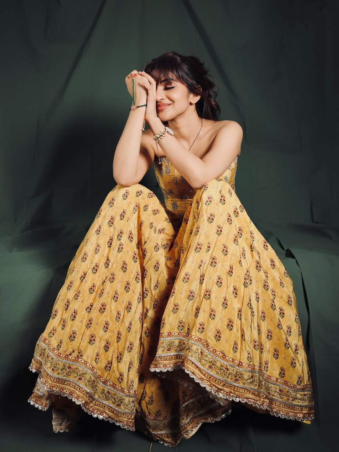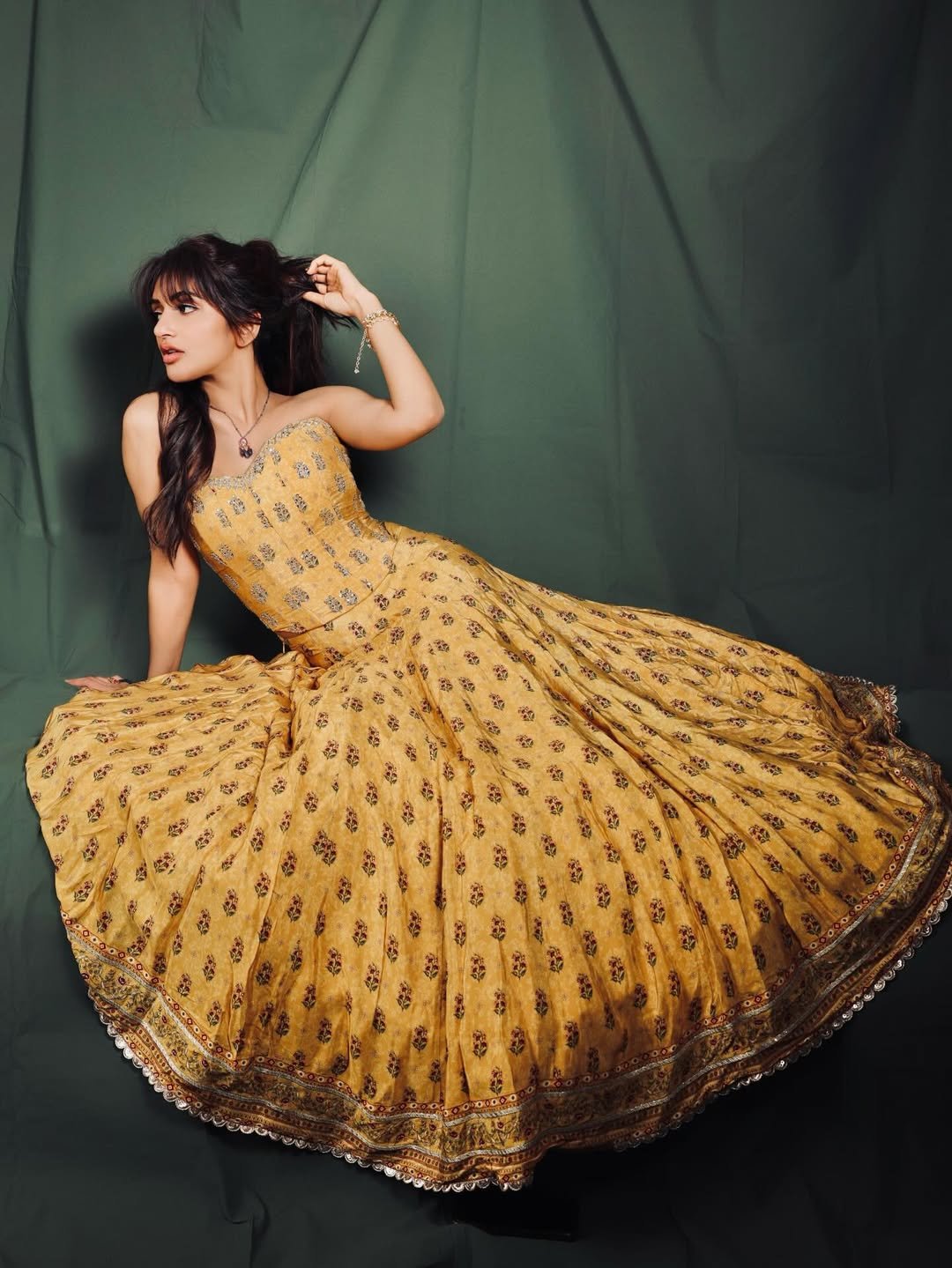 इस फोटोशूट में श्रीलीला म्यूटेड ग्रीन बैकग्राउंड के सामने पोज देती दिख रही हैं, जो उनके लुक को और भी निखार रहा है। उन्होंने स्ट्रैपलेस मस्टर्ड-येलो लहंगा पहना है, जिस पर बारीक फ्लोरल एम्ब्रॉयडरी और शिमरिंग सीक्विन वर्क किया गया है। यह लहंगा उनके ट्रेडिशनल ग्लैमर को मॉडर्न टच देता नजर आता है।